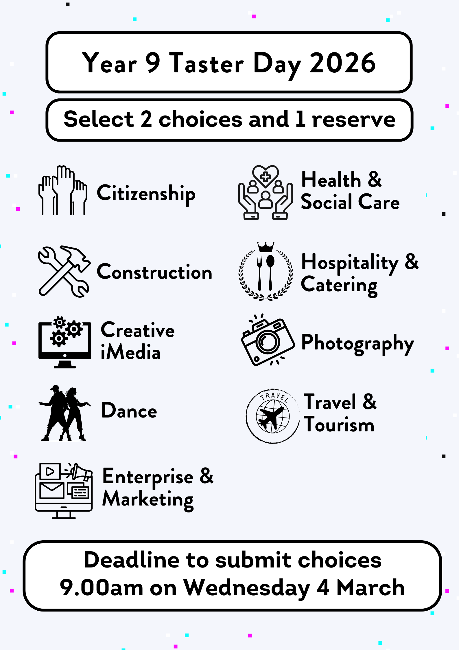 The deadline for Taster Day choices to be actioned is 9.00am on Wednesday 4 March 2026. Submission of their choices after this date may mean they don't get their first preferences.